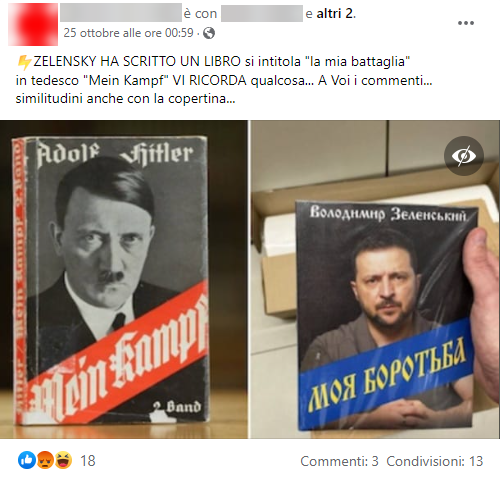 “Zelensky ha scritto un libro, si intitola ‘la mia battaglia’, in tedesco ‘mein kampf’. Vi ricorda qualcosa? A voi i commenti. Similitudini anche con la copertina”.