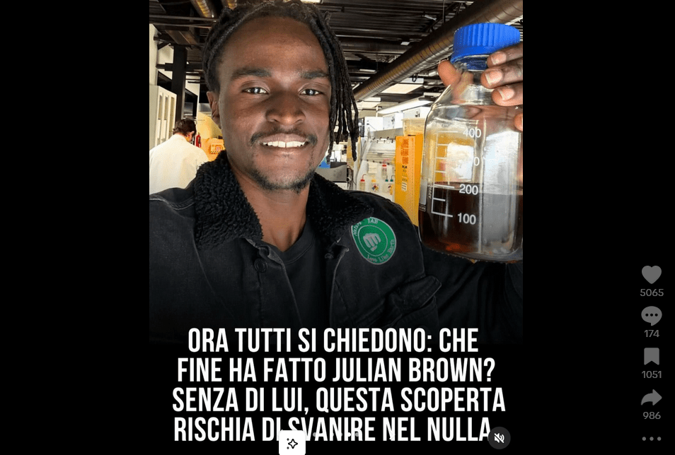 Ci segnalano i nostri contatti il dell’inventore scomparso della formula per trasformare la plastica in carburante. Trattasi di Julian Brown, inventore attivissimo sui social come TikTok, pronto a dichiarare di aver scoperto il segreto per trasformare i rifiuti di plastica in carburante mediante uno straordinario macchinario