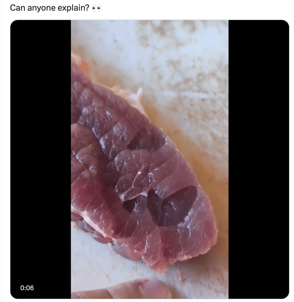 Ci segnalano i nostri contatti un video su X con una fetta di carne che si muove da sola, formando bolle e ondulazioni. Ovviamente nei commenti se ne legge di ogni, arrivando persino ad invocare lo spettro complottista della “carne stampata in 3D” venduta dai malvagi “poteri forti” per privarci del sapore della bistecca.