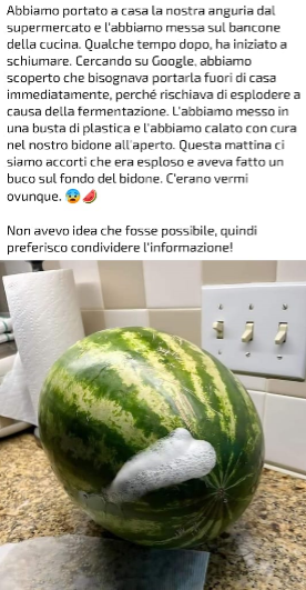 Ci segnalano i nostri contatti un post preso da un gruppo di “immagini assurde” contenenti una foto di una anguria che fermenta ed esplode. La didascalia spiega che l’autore della foto avrebbe scoperto che le angurie andate a male possono fermentare e possono esplodere, e l’esplosione avrebbe danneggiato il cassonetto in cui era riposta.