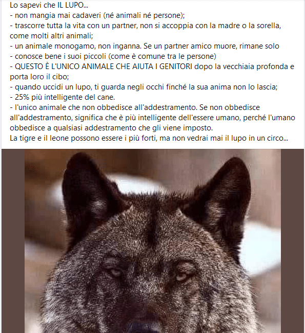 Il post sui lupi che non mangiano cadaveri, non ingannano e altre qualità è un falso