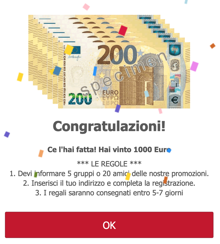 La struttura è la stessa che abbiamo visto altre volte: un messaggino contenente un link e varie richieste di cliccare, inviato mediante Messenger o WhatsApp. Una volta cliccato si viene accolti da una paginetta con immagini stock