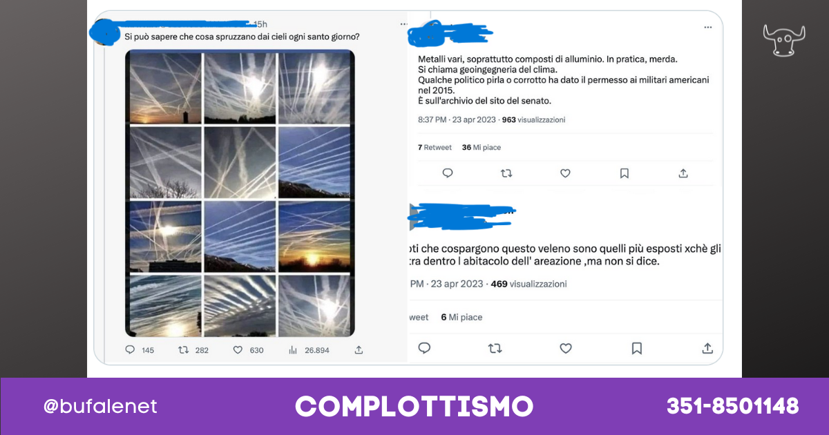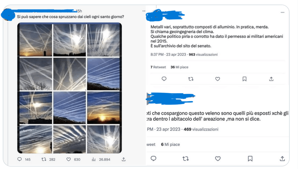 È tornata la bufala della geoingegneria e delle scie chimiche al Senato. Siamo di fronte ad un netto incremento della diffusione delle stesse, che si riuniscono alle altre teorie del complotto in visione antioccidentale.