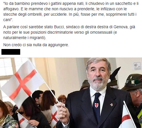 Un post pubblicato da un utente Facebook riporta un’affermazione attribuita al sindaco di Genova Marco Bucci. Secondo alcune testate il primo cittadino del capoluogo ligure, durante una giunta, avrebbe rivelato che da bambino era solito maltrattare gli animali.