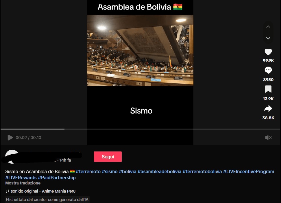 A metà tra il ragebait e il clickbait, ecco che arriva la bufala creata con AI del terremoto al Parlamento Boliviano. Un breve video, frutto integrale dell’Intelligenza Artificiale, caricato ad una qualità abbastanza degradata per impedire una analisi da altri tool automatici ma con anomalie che non sfuggono agli strumenti dei social dove viene caricato ed all’occhio umano.