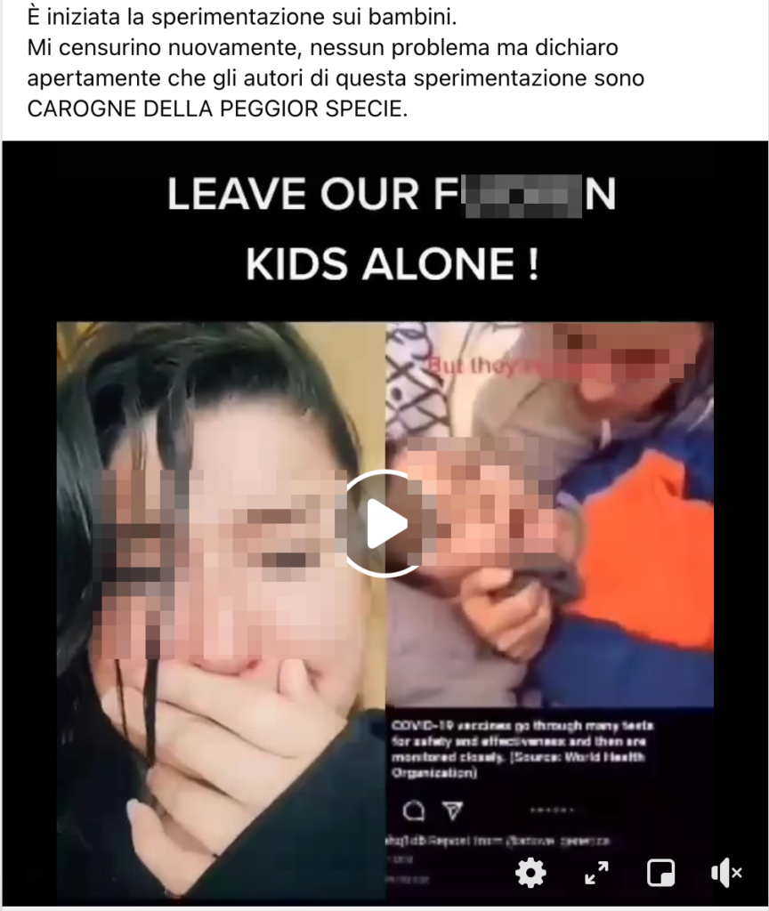 Succede quindi che si consuma il solito schema che abbiamo visto altre volte. Appaiono post che condannano le vaccinazioni pediatriche antiCOVID, ma accompagnati da video che nulla hanno a che fare coi vaccini contro COVID19