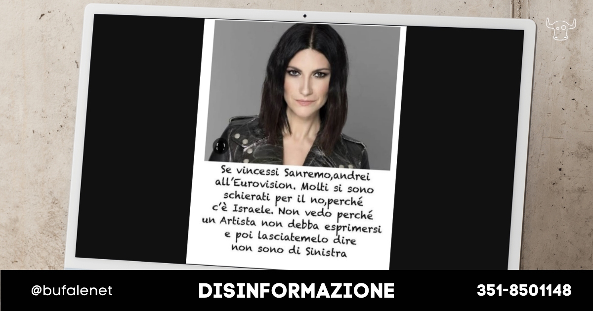 Ci segnalano un virgolettato attribuito alla cantante Laura Pausini sull’Eurovision pubblicato su diversi social. Il virgolettato riporta una card con la frase “Se vincessi Sanremo andrei all’Eurovision. Molti si sono schierati per il no perché c’è Israele. Non vedo perché un artista non debba esprimersi e poi lasciatemelo dire non sono di Sinistra”.