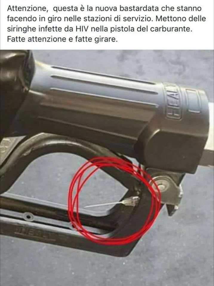 Attenzione, questa è la nuova bastardata che stanno facendo in giro nelle stazioni di servizio. Mettono delle siringhe infette da HIV nella pistola del carburante. Fatte (sic!) attenzione e fatte (sic!) girare.