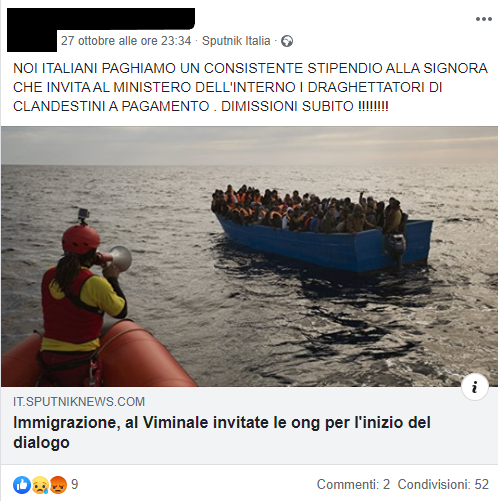 Verissima la notizia, che risale al 25 ottobre. Luciana Lamorgese, ministra dell’interno, ha convocato al Viminale le ONG Medici Senza Frontiere, Mediterranea saving humans, Open Arms, Pilotes Volontaires, Sea Eye, Sea Watch e Sos Méditerranée. Un traguardo, l’ha definito la portavoce di Mediterranea Alessandra Sciurba, essere passati dall’essere considerati nemici della patria a interlocutori. Ma lo scoppio ritardato del web non si è fatto attendere. Ovviamente l’incontro tra il Viminale e le ONG è diventato immediatamente un complotto ai danni della razza italica, come si evince dalla didascalia dell’articolo condiviso da un sostenitore leghista: