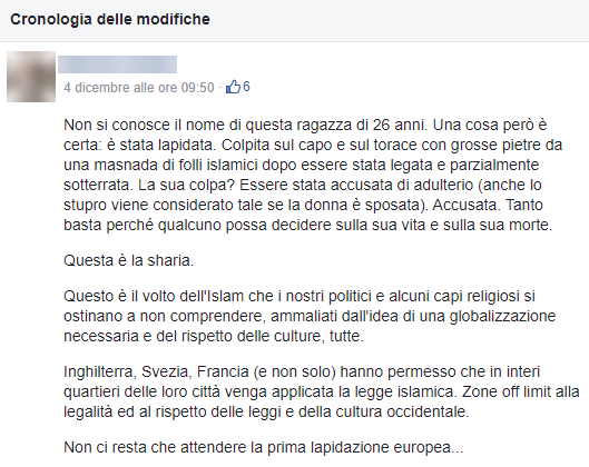 Con il pretesto di lanciare l’ennesima invettiva contro l’Islam, declinando l’argomento con accostamenti tra la sharia, la politica dell’accoglienza e soprattutto i religiosi che professano messaggi di pace e uguaglianza, una utente Facebook ha pubblicato un post in cui mostra le immagini di una lapidazione accompagnate da un messaggio che nel calderone cita l’Inghilterra, la Svezia e la Francia. Questi 3 Paesi vengono indicati come teatri in cui alcune città sono diventate zone off-limits in quanto in alcuni quartieri esisterebbe una sorta di tolleranza verso la legge islamica.