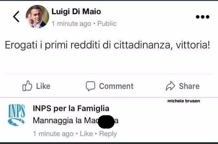 Ma abbiamo anche una seconda pagina clone, INPS per la famiglia (ma con spazi) che nasce e muore dedicando un pensiero al Vicepremier Di Maio, il cui Contratto di Governo ha dato origine al RdC e al calvario di INPS per le famiglie. Pensiero, rigorosamente, espresso da un’esplosiva e spontanea bestemmia