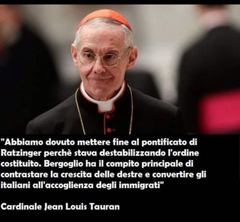“Abbiamo dovuto mettere fine al pontificato di Ratzinger perché stava destabilizzando l’ordine costituito. Bergoglio ha il compito principale di contrastare la crescita delle destre e convertire gli italiani all’accoglienza degli immigrati”