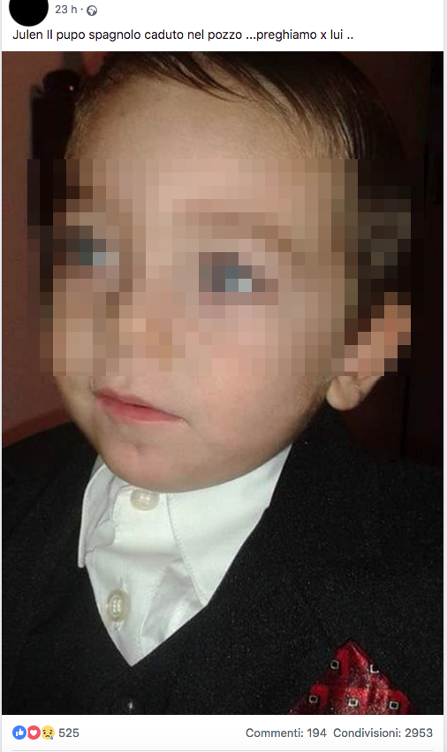 “Julen il pupo spagnolo caduto nel pozzo… preghiamo per lui”. In originale la foto non era censurata
