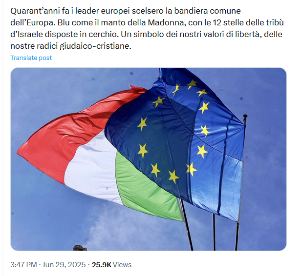“La bandiera Europea raffigura le dodici tribù di Israele e la Madonna”: questo un post apparso oggi su X che contiene un errore fattuale. Errore fattuale perché, per sua concezione la bandiera europea non poteva, non può e non potrà avere simboli confessionali.