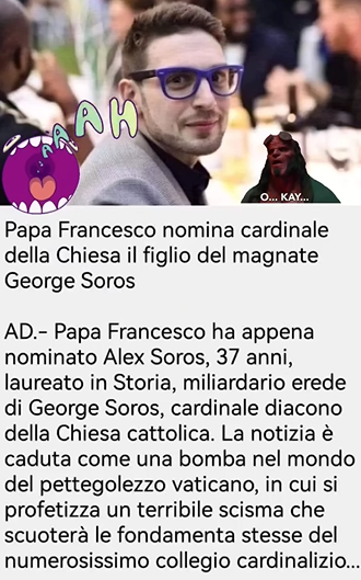 Ci segnalano i nostri contatti un testo che annuncia la nomina del Cardinale Alex Soros, figlio di quel Soros feticcio dei complottisti di mezzo mondo, con tanto di annunci di scismi, gif animate e urla digitalizzate
