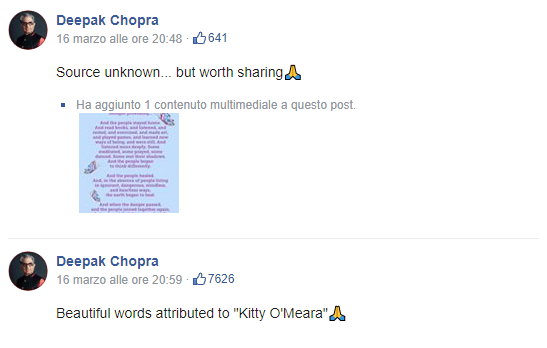 In poche parole: Deepak Chopra aveva condiviso la poesia che in un primo momento non aveva attribuzioni; i follower gli avevano fatto notare che l’autrice era Kitty O’Meara, autrice contemporanea nonché viva.