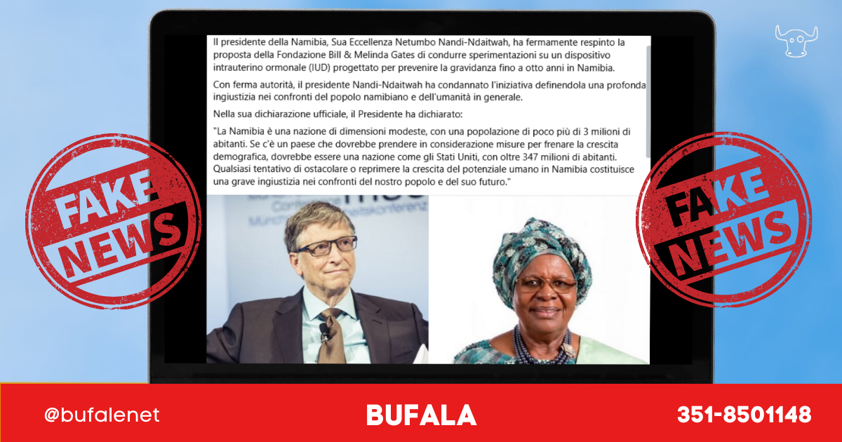 In primo luogo la Presidente della Namibia non ha mai rilasciato simili disinformazioni e non ci sono in programma interventi della Fondazione Gates per diffondere la contraccezione intrauterina, citata nel testo inventato, in Namibia.