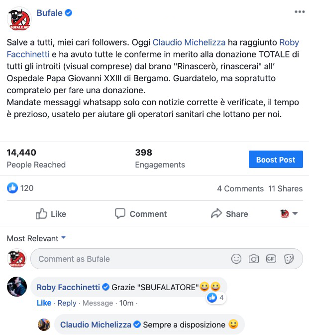 Ebbene, Roby Facchinetti su Facebook ha sì associato la canzone “Rinascerò, rinascerai” all’emergenza Coronavirus, ma non nel modo in cui se ne parla su WhatsApp. Il suo post, infatti, ci dice che intende dar conforto a queste persone, in particolare a quelle di Bergamo, invitando tutti a donare presso lo stesso Ospedale Papa Giovanni XXIII, ma è cosa ben diversa rispetto a quello che trapela tramite l’app di messaggistica: