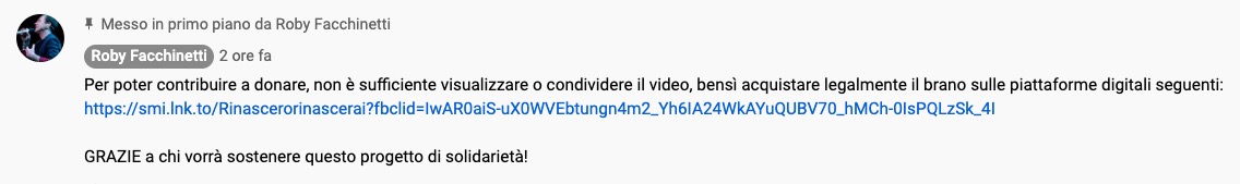 Le donazioni, anche nel caso di Bergamo, non possono avvenire in automatico in base alle visualizzazioni Youtube. E questo vale anche per il brano “Rinascerò, rinascerai” di Roby Facchinetti”. A meno che il diretto interessato non ufficializzi iniziative “a parte”.