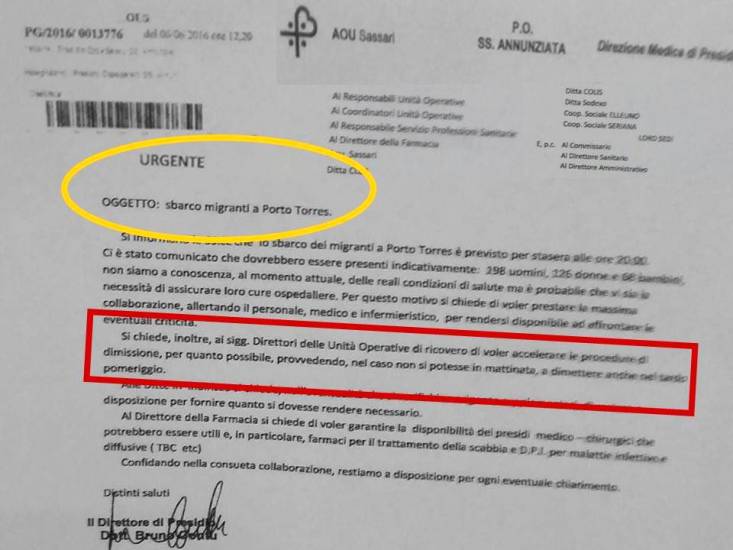 Nella circolare del direttore del Presidio si invitano i Direttori delle Unità operative di ricovero a “voler accelerare le procedure di dimissione, per quanto possibile, provvedendo, nel caso non si potesse in mattinata, a dimettere anche nel tardo pomeriggio”. Ciò significa chiaramente velocizzare procedure già avviate e non dimettere chi non è nelle condizioni di tornare a casa. Peraltro, solo il clinico può decidere chi e quando dimettere e non può essere una circolare a imporgli le dimissioni. Questo dovrebbe sapere il deputato P., prima di iniziare una inutile polemica sul nulla. La sanità sassarese è pronta ad accogliere le persone in difficoltà e tantissimi professionisti si sono messi a disposizione per l’arrivo della nave di migranti e questo non può essere mistificato da bufale costruite ad arte.