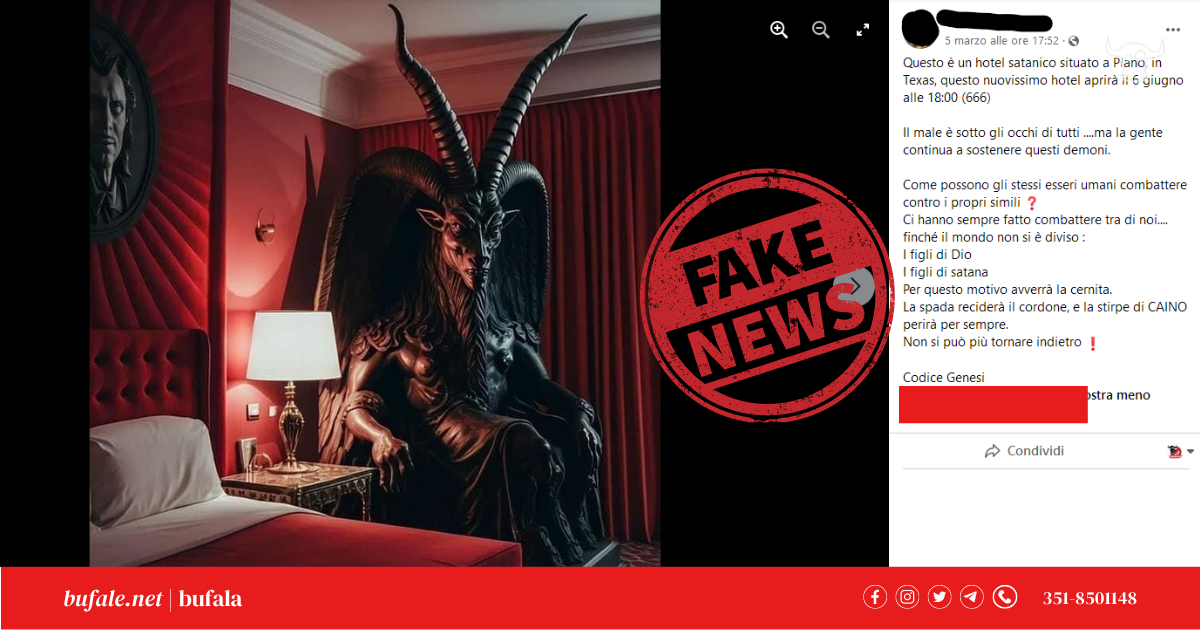 Ci segnalano i nostri contatti la presunta foto di un hotel satanico a Plano, in Texas. In realtà è un contenuto creato artificialmente con la CG, in singrafia.