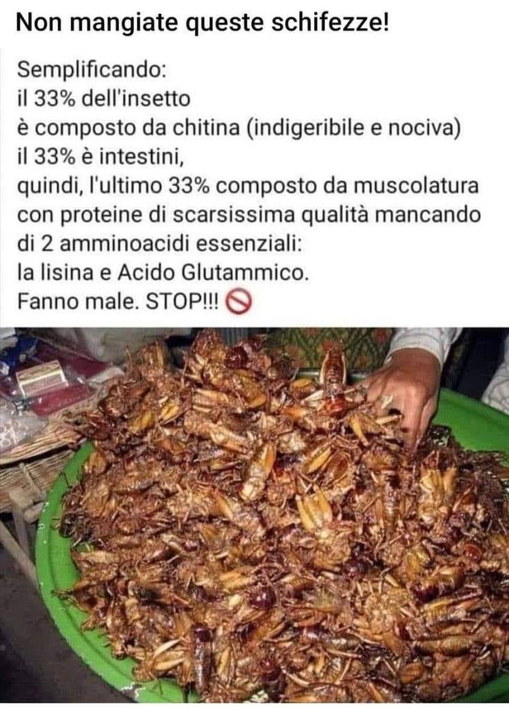 Omettiamo di concentrarci sulle “percentuali a cavolo” tipiche di tutto il mondo delle fake news e del complottismo. Con diverse tipologie di insetti e solo tre approvate per il consumo, parlare con certezza di “33% di questo e quello” dovrebbe già essere un immane campanello di allarme.