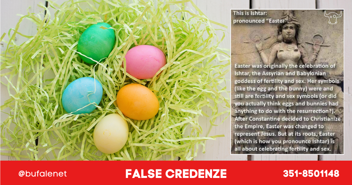 A pensarci l’argomento alla base della bizzarra teoria “razionalista” è poco più che un “falso amico” linguistico. In Inglese Pasqua si dice “Easter”, e Easter suona grossomodo come “Ishtar”, la dea Babilonese del sesso e della guerra (diciamo che si teneva assai impegnata).