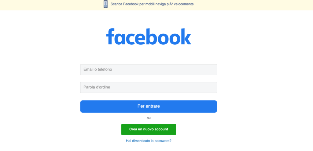 Invece questa è la pagina finta: una grottesca imitazione della pagina di ingresso di Facebook costruita per carpire con l’inganno i vostri dati personali