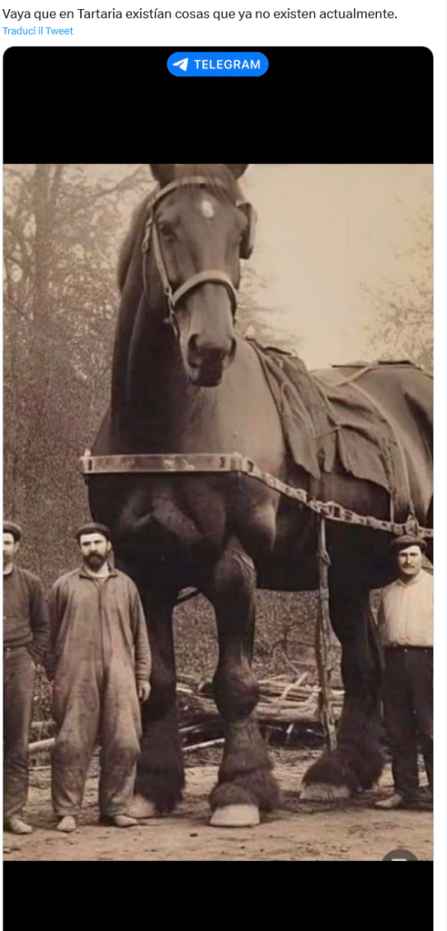 In questo caso la presunta foto del cavallo enorme deriva da una galleria di immagini create per mezzo dell’Intelligenza Artificiale.