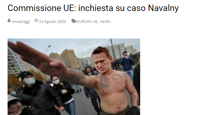 Sui social circola una foto di Alexei Navalny, oppositore di Vladimir Putin, a torso nudo e con il braccio destro alzato in un saluto nazista e con il tatuaggio di Adolf Hitler sul petto.
