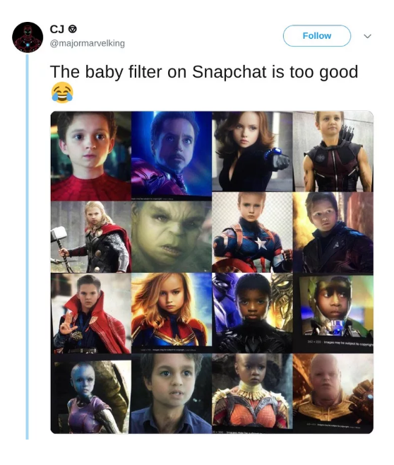 Nel maggio 201, gli utenti dei social media hanno pubblicato un numero di immagini che presumibilmente hanno mostrato varie celebrità da “bambini”. L’utente di Twitter @MajorMarvelKing, ad esempio, ha applicato questo filtro Snapchat a varie immagini dei film di Avengers: