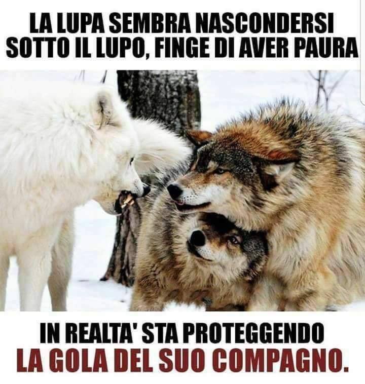 La lupa sembra nascondersi sotto il lupo, finge di aver paura, recita la bizzarra didascalia, in realtà sta proteggendo la gola del suo compagno.