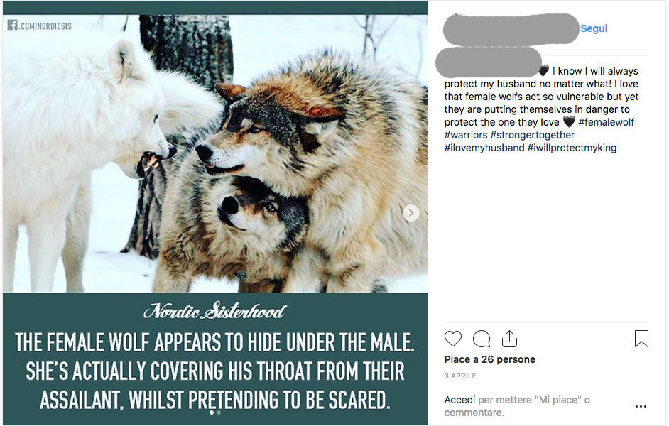 Comincia tutto quando alcune pagine come Nordic Sisterhood e affini, attratte dall’iconografia “nordica” (Jean Paul è di Toronto, Canada, peraltro, e la foto è stata invece scattata nel Minnesota…) della foto hanno scaricato l’immagine, che all’epoca non conteneva il watermark, ridenominandola come lupa che sta proteggendo la gola del suo compagno ed imbastendo una storiella pseudoeducativa al riguardo. Quella che ora leggerete.