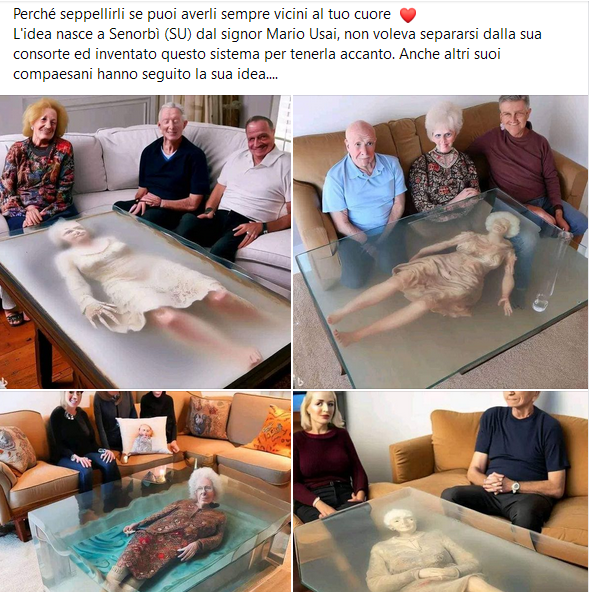 Secondo la bufala virale un cittadino di Senorbì avrebbe tumulato la consorte in un tavolino di resina epossidirica, venendo preso a modello da altri cittadini per la creazione del suo eretico “attacco d’arte”.