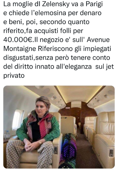 Sui social sta prendendo piede un’immagine che mostra la moglie di Zelensky a bordo di un jet privato con addosso un outfit firmato da Gucci.