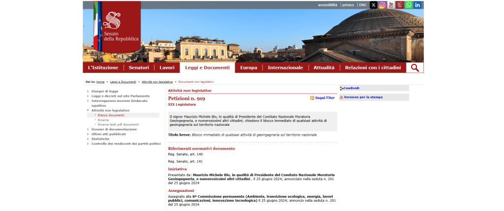 Tramite la petizione, questi numerosissimi cittadini hanno chiesto il blocco immediato di qualsiasi attività di geoingegneria sul territorio nazionale.