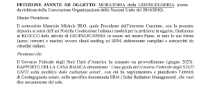La geoingegneria è una disciplina che si studia…chiedere che non si faccia ha poco senso: sarebbe come chiedere di vietare la fisica…non ha molto senso, occorrerebbe specificare quali siano le applicazioni della disciplina ritenute dannose e perchè, e soprattutto esplicitare quali siano le attività da impedire su territorio italiano.