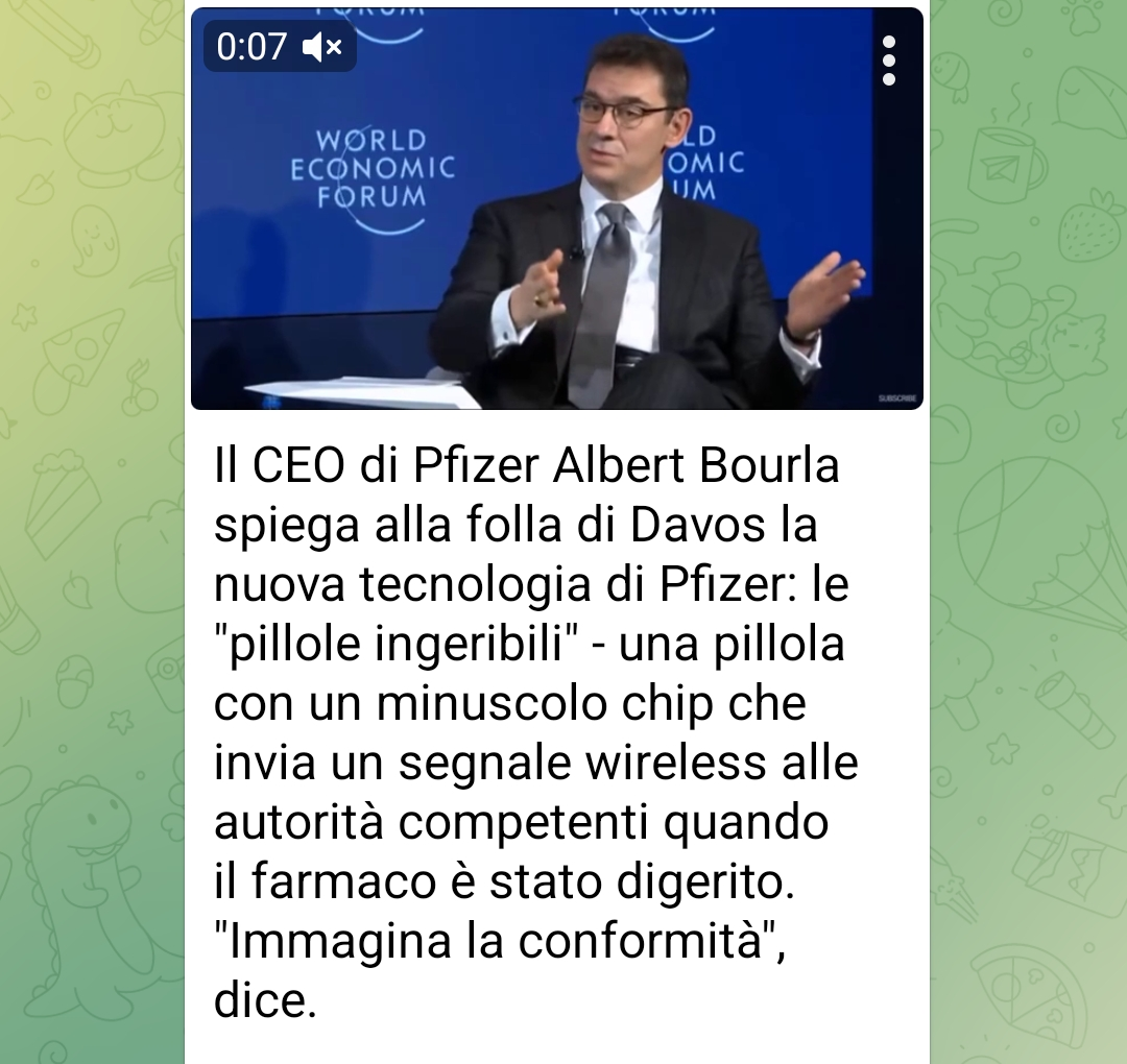 Una pillola col microchip di Pfizer? Questo è il proclama di un canale Telegram che negli ultimi giorni è stato sdoganato sui social con uno screenshot. Secondo il testo condiviso, il CEO dell’azienda farmaceutica Albert Bourla avrebbe annunciato a Davos l’arrivo di “una pillola con un minuscolo chip”. La destinazione d’uso della suddetta pillola non è riportata. I nostri lettori ci hanno chiesto di verificare.