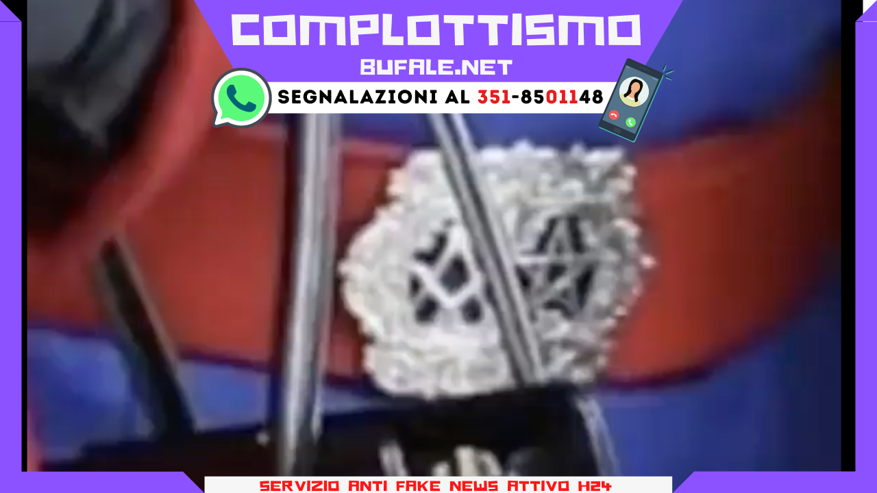 Lo zoom sulla figura vestita di blu mostra una presunta fibbia massonica. L’accordo spaventoso sale in un crescendo da film horror.