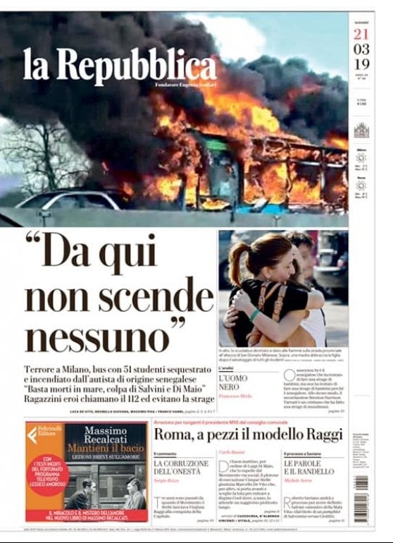 Terrore a Milano, bus con 51 studenti sequestrato e incendiato dall’autista di origine senegalese. “Basta morti in mare, colpa di Salvini e Di Maio”. Ragazzini eroi chiamano il 112 ed evitano la strage.