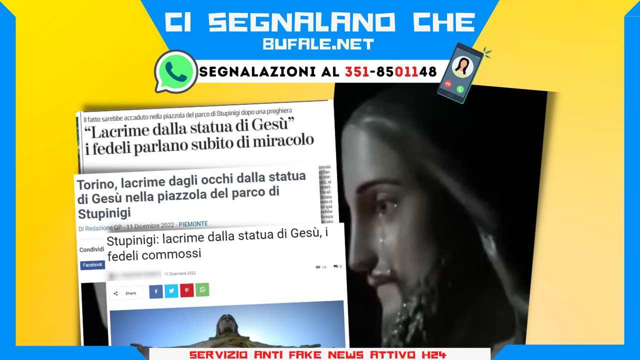 Per il momento non si riscontrano i “numerosi” video e le numerose foto che documenterebbero il “miracolo” della statua di Gesù che piange a Stupinigi. Il video – l’unico, per ora – pubblicato in rete mostra il volto ravvicinato del Cristo con un liquido che collega l’occhio alla guancia, ma senza alcun movimento che lasci intendere un pianto in atto.