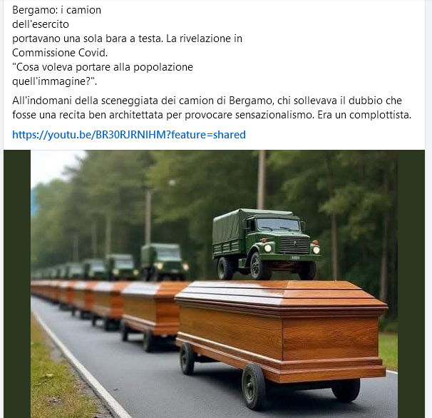 Torna, propagandata dalle solte immagini generate da AI che, da quando X ha popolarizzato con Grok e Flux la AI disponibile per tutti e con pochi limiti sono diventate il feticcio espressivo di ogni complotto, la teoria per cui sì, le “Bare di Bergamo” esistono, ma mettevano un camion per bara per terrorizzare la gente.