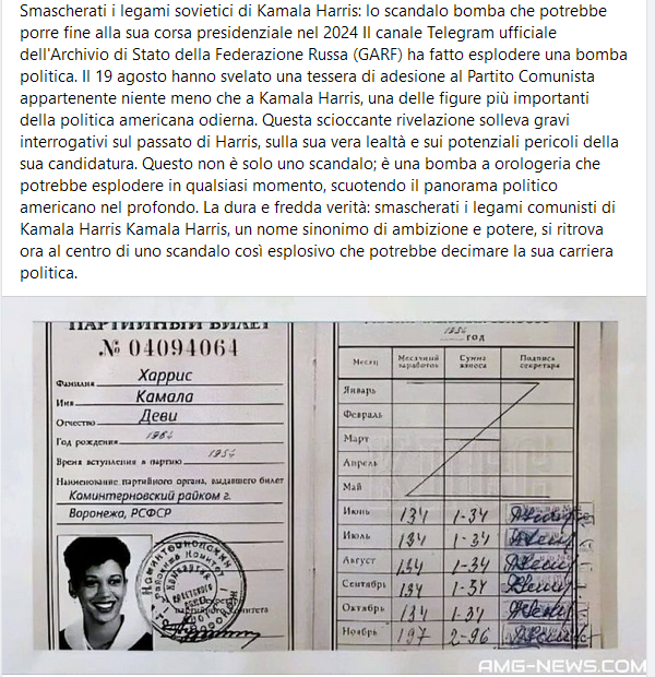 La tessera del partito comunista russo di Kamala Harris fa parte di un ricco filone di articoli “doppelganger“, false testate giornalistiche occidentali e non create apposta su Telegram per interferire con la campagna elettorale.