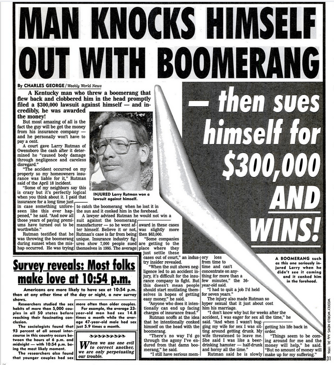 Torna di tanto in tanto tra social e catene virali su Whatsapp la tragicomica storia di Larry Rutman che ha vinto una causa contro se stesso. Secondo la narrazione, a volte una semplice card, a volte arricchita di note in legalese per cercare di darle credito, Larry Rutman si sarebbe colpito da solo con un Boomerang per farsi causa e vincere.