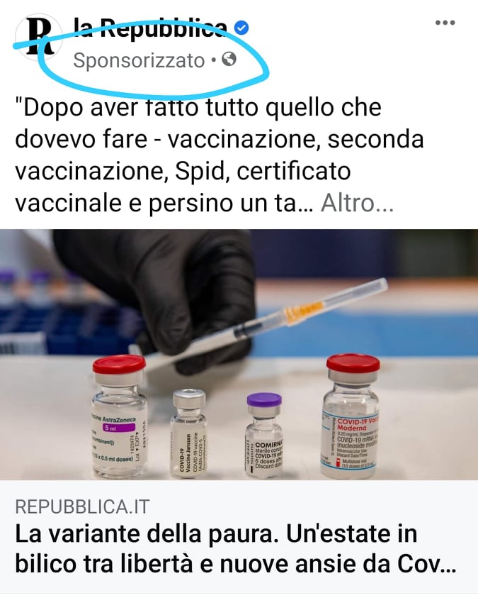 In un mondo in cui, gratuitamente, persone come il Dottor Paolo Spada ci ricordano che rischi ci sono, ma grazie alla diffusione della vaccinazione riusciremo ad “ammansire” COVID19 come abbiamo fatto con tutte le più terribili malattie infettive che hanno afflitto la nostra esistenza, non riteniamo logico vedere annunci a pagamento che portano ad articoli a pagamento, letteralmente spinti dalla paura.