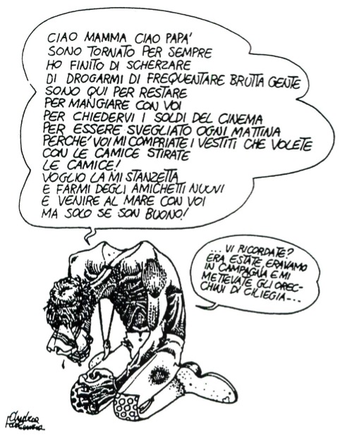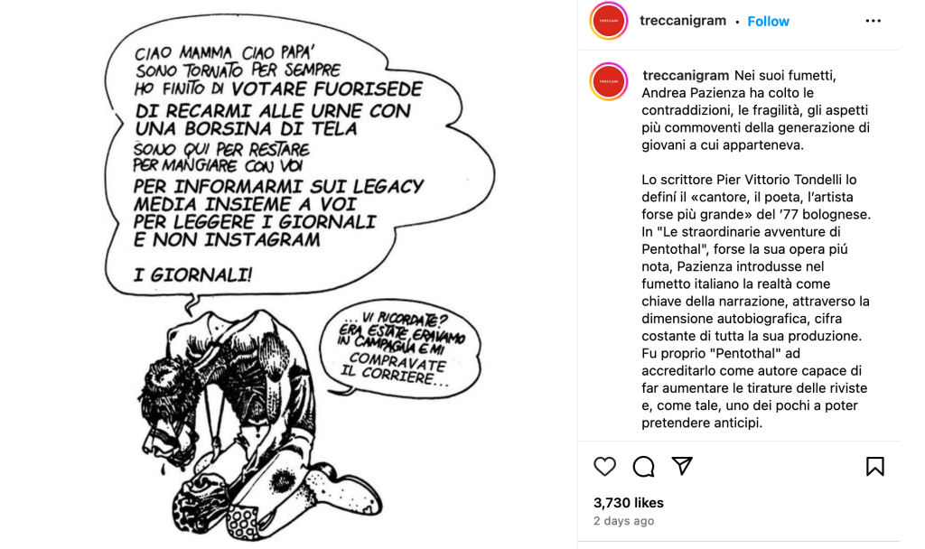 Ci segnalano una vignetta di Andrea Pazienza sui social Treccani, per essere precisi sul profilo Instagram della nota enciclopedia, “Treccanigram”.
