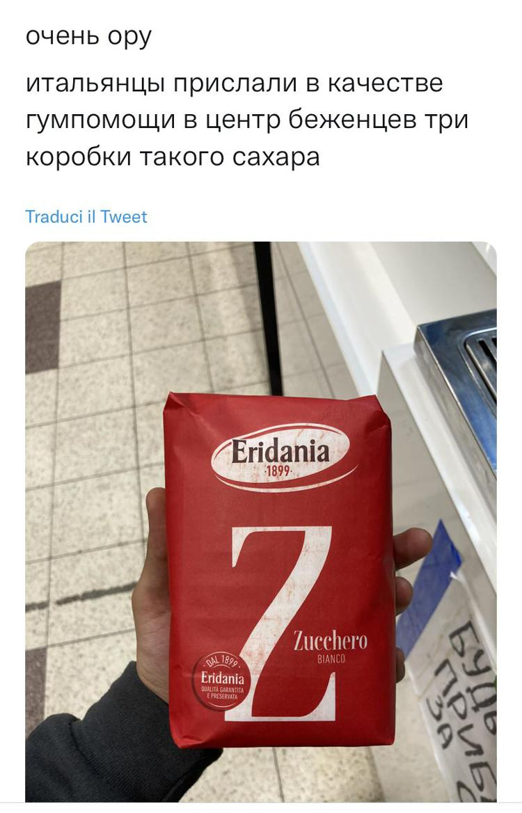 Nessuna perplessità collettiva da parte dei profughi ucraini sulla Z presente sulle confezioni di zucchero italiano Eridania: solo un singolo tweet, ovviamente bersagliato da polemiche.