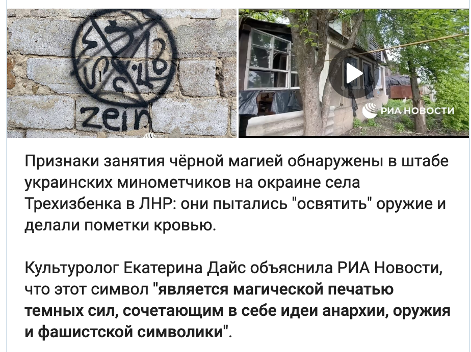 Una culturologa ha riconosciuto in un graffito una unione di rune “naziste” ed “ebraiche”, rigorosamente tracciate a mano libera e senza mai staccare il pennello dal muro (cosa evidentemente satanista) che infonderebbero all’Esercito Ucraino oscuri poteri nazi-giudeo-satanisti.