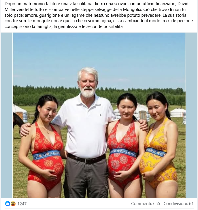 Un disturbante filone dello Slop AI è quello della storia dell’americano 50enne David Miller che ha messo incinta tre sorelle in Mongolia. Parliamo ovviamente dello slop, storielle create con minimo sforzo dalla AI per diventare virale.