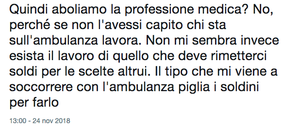 Quindi aboliamo la professione medica? No, perché se non l’avessi capito chi sta sull’ambulanza lavora. Non mi sembra invece esista il lavoro di quello che deve rimetterci soldi per le scelte altrui. Il tipo che mi viene a soccorrere con l’ambulanza piglia i soldini per farlo
